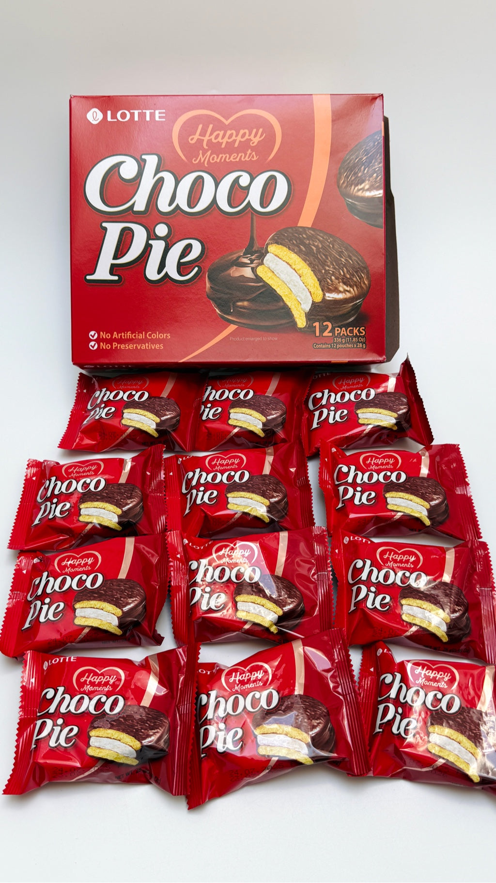 Choco Pie | Lotte — Soft, marshmallow-filled cakes coated in smooth chocolate, offering a delightful combination of fluffy, sweet, and chocolaty flavors in every bite.
